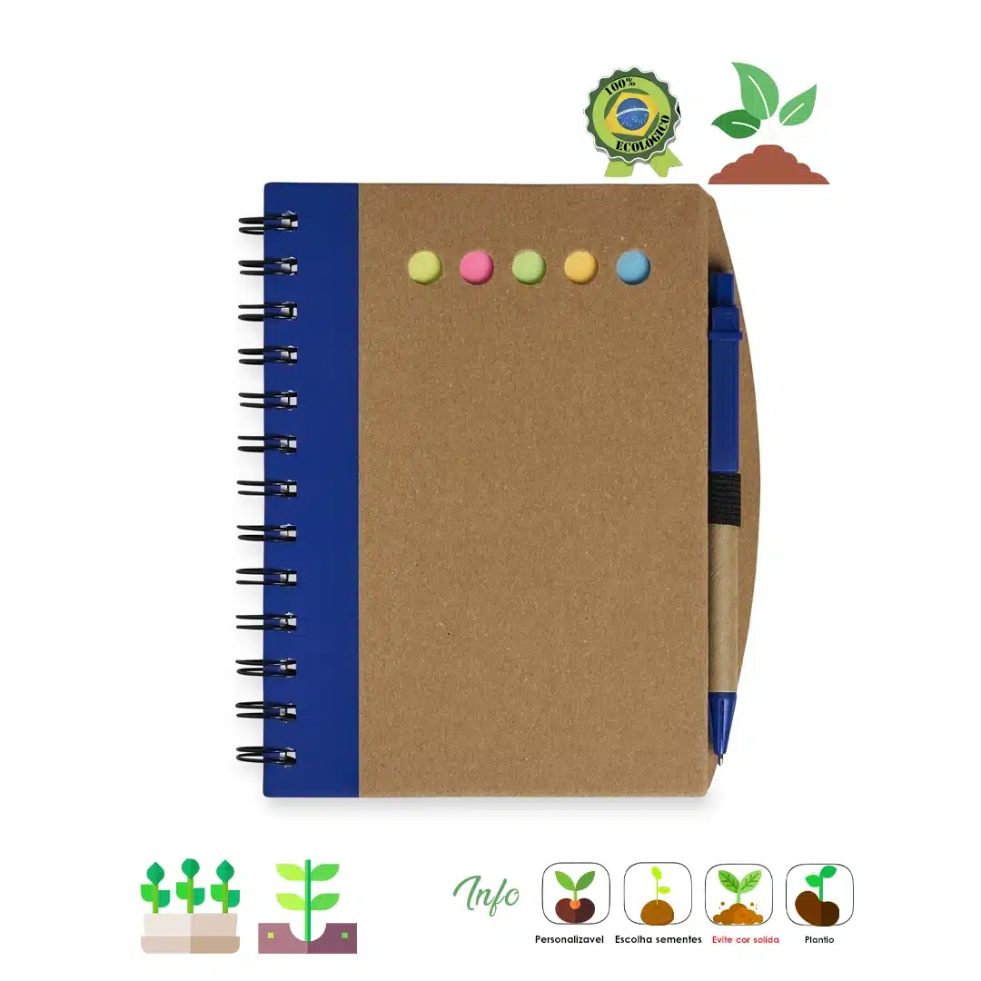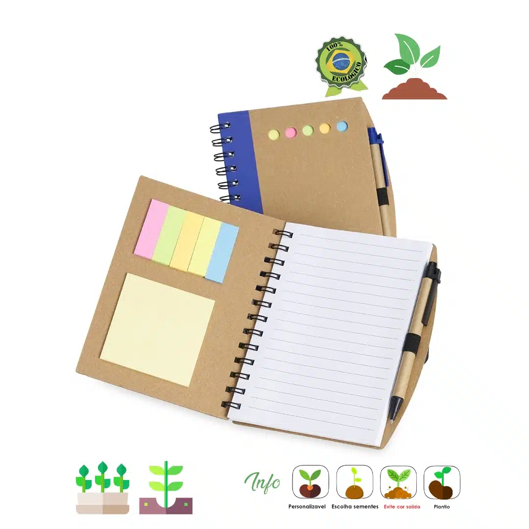 Caderno em papelão rígido com caneta. Possui 6 blocos de autoadesivos com aproximadamente 21 folhas e bloco pautado com aproximadamente 70 folhas. Caneta de papelão com detalhes plástico, carga esferográfica azul e acionamento por clique.