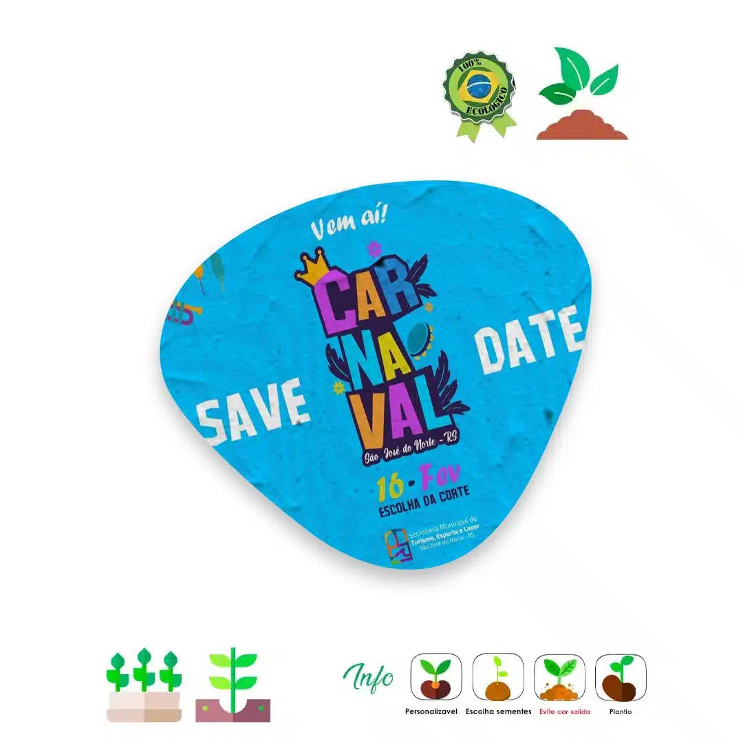O calor do Carnaval pede um refresco ecológico! Nosso Leque de Papel Semente 22×19 cm é a opção sustentável para manter a folia fresca e sem desperdício. Feito com papel semente biodegradável, ele pode ser plantado após o uso, transformando-se em novas vidas.